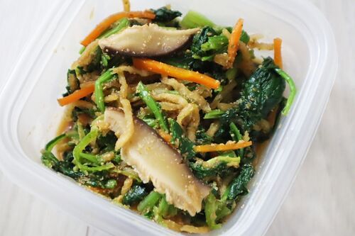 ほうれん草と切り干し大根の胡麻和えの材料 ほうれん草200g 切り干し大根20g 干し椎茸4g にんじん10g 醤油40g すりごま18g パルスイート2g 水150ml ほうれん草と切り干し大根の胡麻和えの作り方 ほうれん草をゆで、かたく絞り、食べやすい大きさに切っておき…